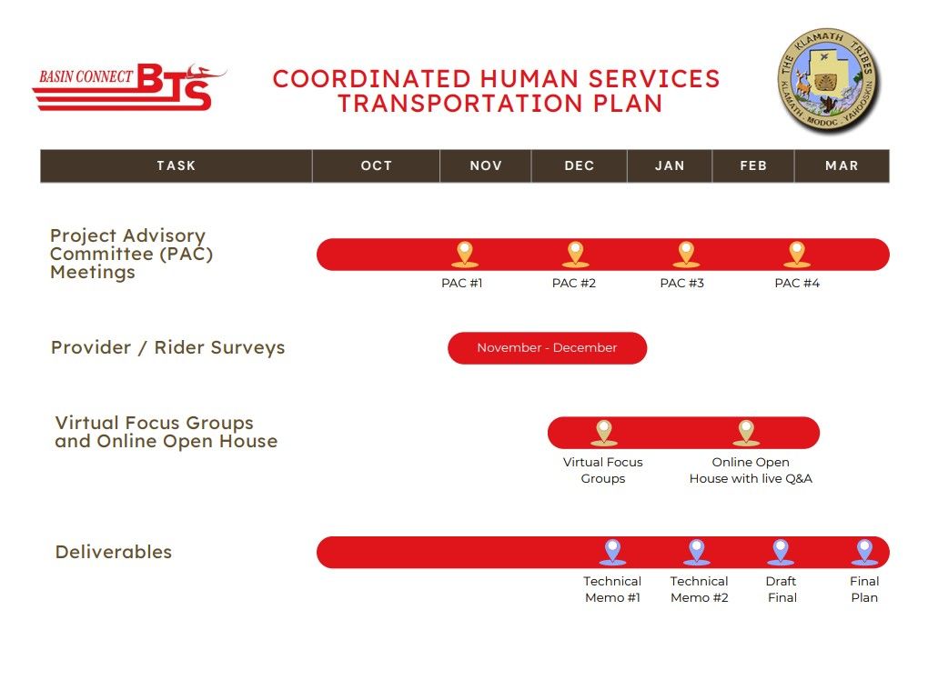 Between now and early spring 2026, we will work with Klamath County’s seniors, tribal members, people with disabilities, low-income individuals, youth, veterans, and service providers to understand mobility needs and gaps. This information is the basis of our whole planning process and helps us shape the future of public transit in Klamath County.